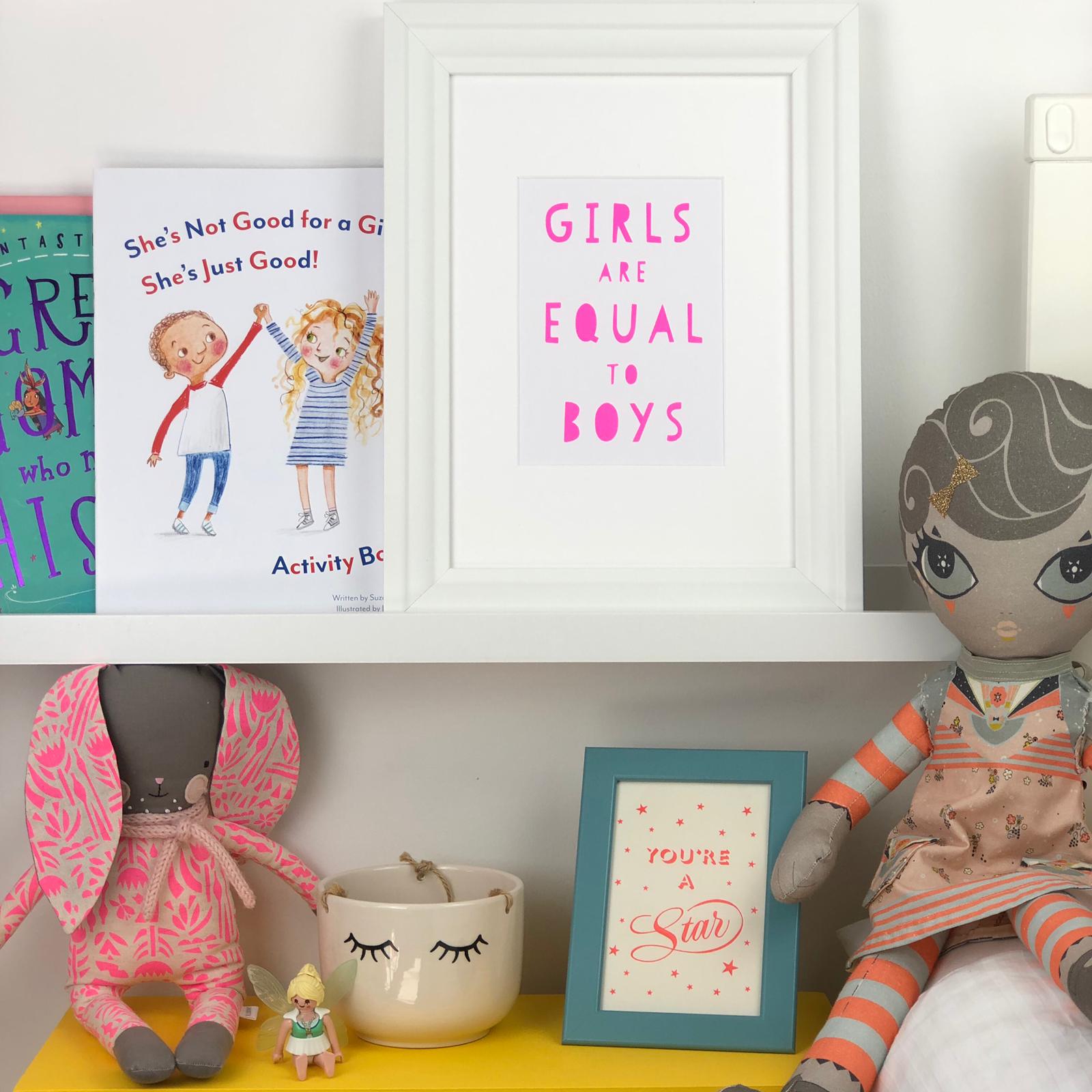 Working in collaboration with Flat 102 this beautifully bright print is the perfect way to spread the message that ‘girls are equal to boys’. It’s a line taken from our first book She’s Not Just Good For A Girl, She’s Just Good! when Frank finally gets the fact that Florence can be just as good as him at sport; that it’s about passion not whether you’re a boy or girl.